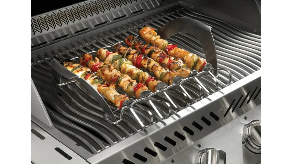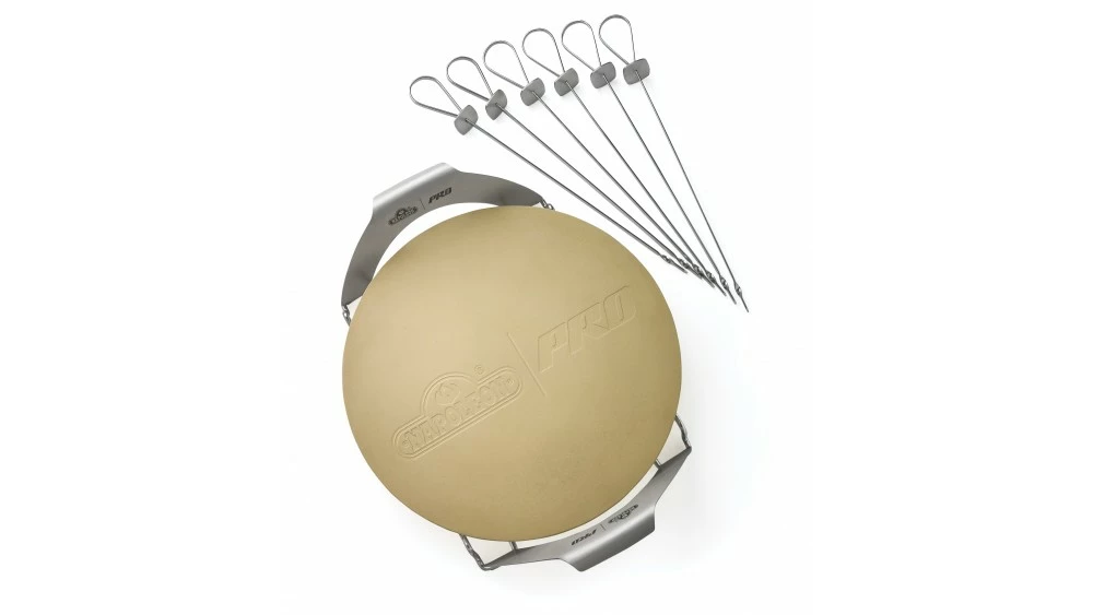 The Napoleon Pro Pizza Stone with Skewers and Rack are the perfect grilling tools in one accessory pack. Includes pizza stone, stainless steel dual-purpose rack and six skewers. The porous surface of the pizza stone pulls moisture away from the pizza crust making for light crispy results. The rack allows for easy handling and grilling for ribs, roasts and chickens. The 14-inch stainless steel skewers provide length and strength for the most creative of kebabs. All in all a great BBQ accessories to complement any Napoleon Grill.